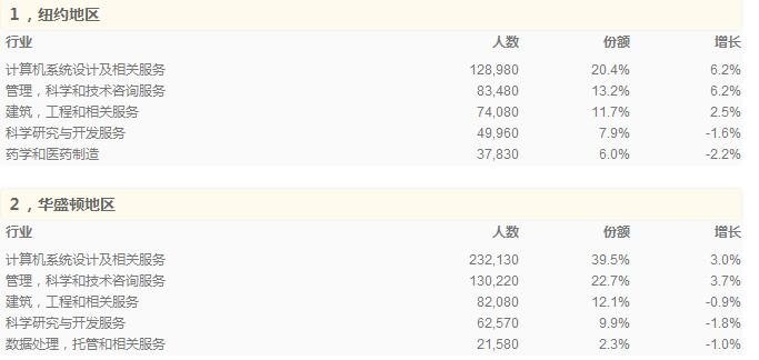 下面是最大的10個都會中心的最大的5個產業的細節。份額是指該行業人員占該地區先進產業總人數的比例,增長是指2013到2015年的增長。