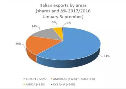 意大利向各地區(qū)的出口份額及2017/2016年1到9月份增幅百分比。