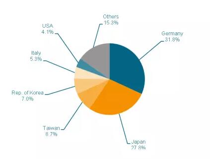 根據德國機械設備制造業(yè)聯(lián)合會(VDMA)、德國國家統(tǒng)計局統(tǒng)計的52個報告國家的出口數據,2016年全球塑料和橡膠機械向中國的供應量達到19.7億歐元,與上年相比下降了7.1%。德國在全球對華出口中排名第一,占31.8%,其次是日本(27.8%)、臺灣(8.7%)和韓國(7.0%)。