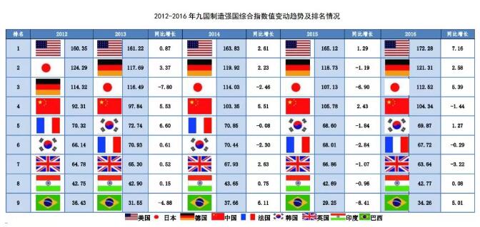 2、2012—2016年中國指數(shù)值增長最大,符合制造強(qiáng)國戰(zhàn)略預(yù)期。