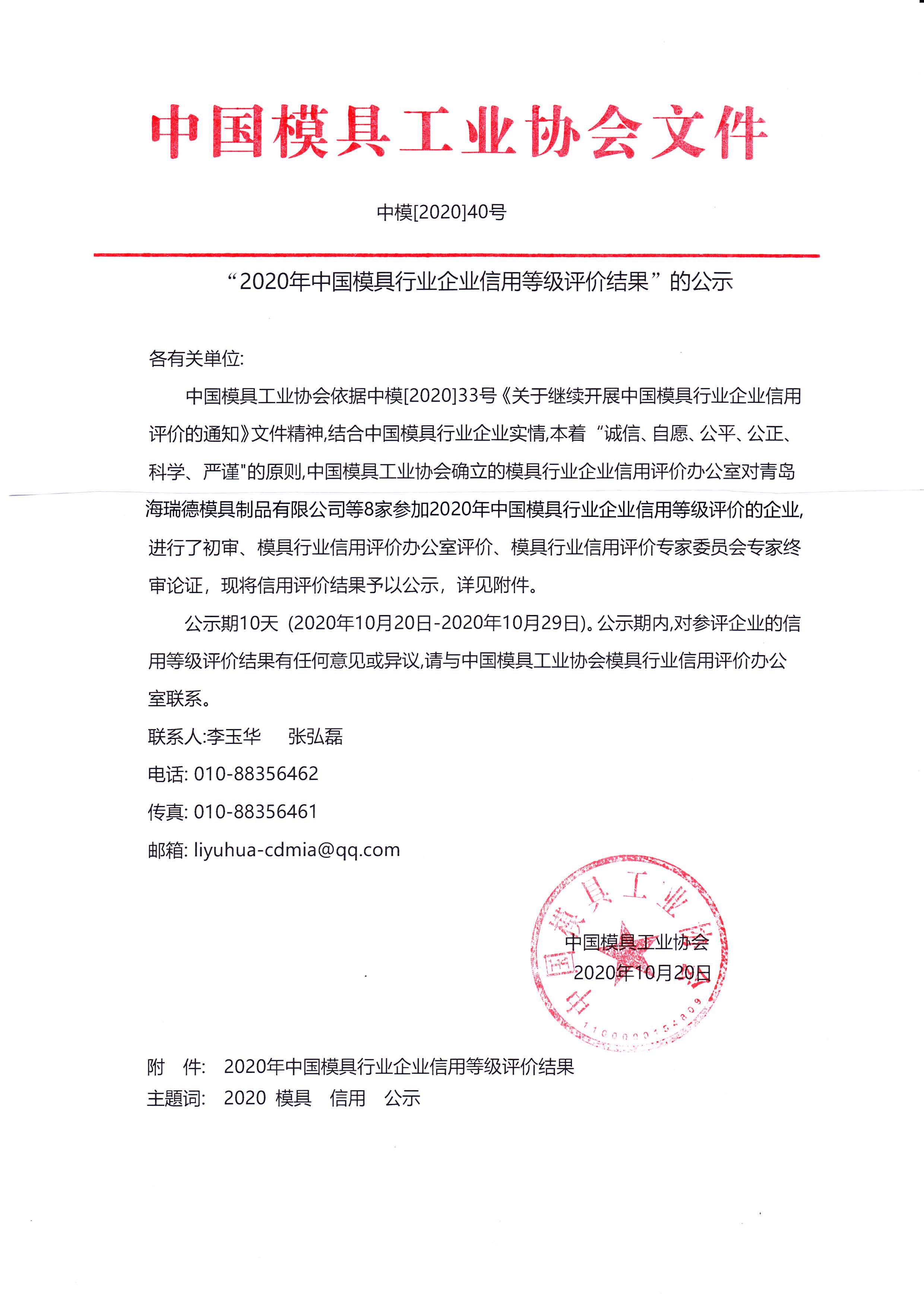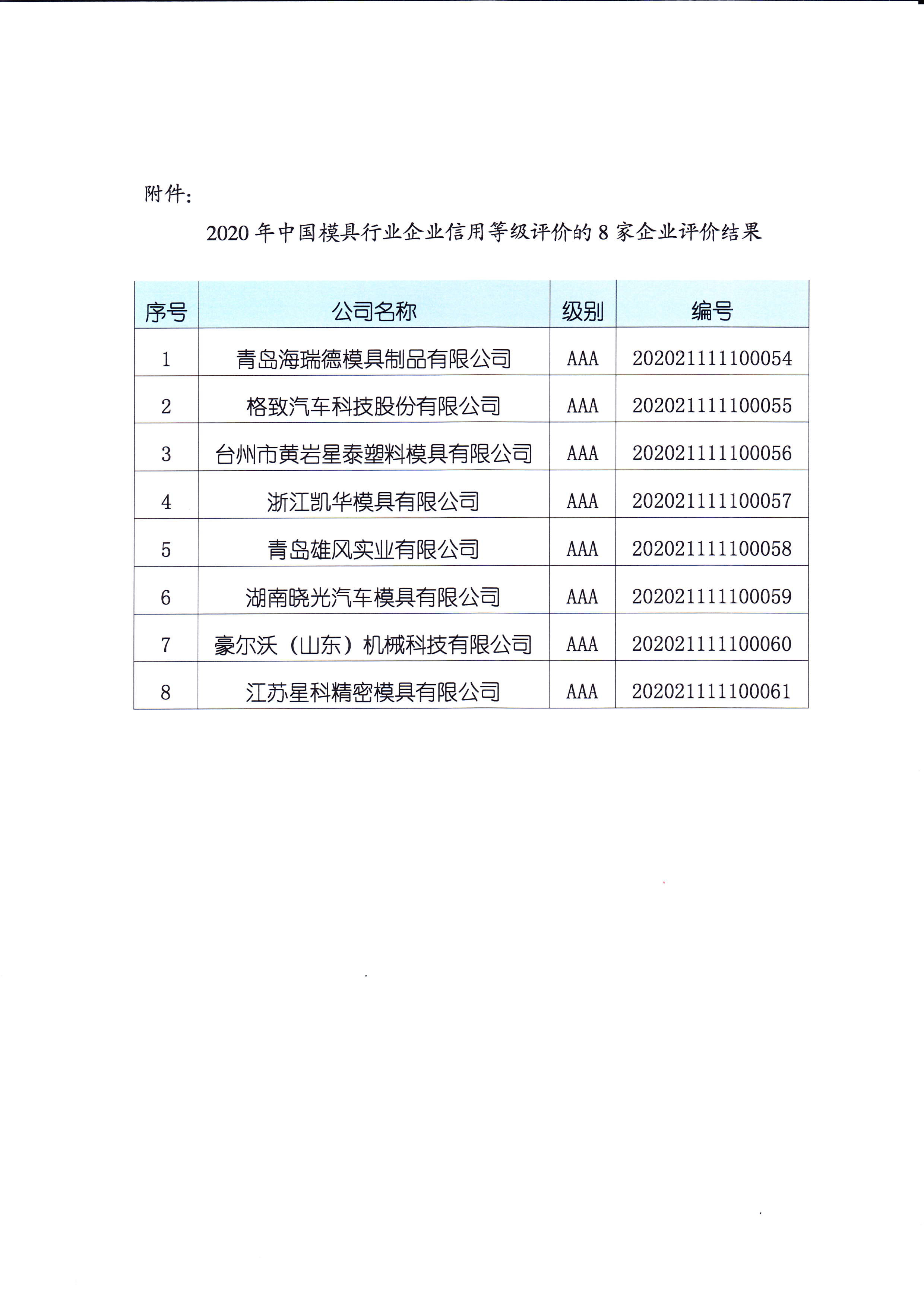 “2020年中國模具行業企業信用等級評價結果”的公示