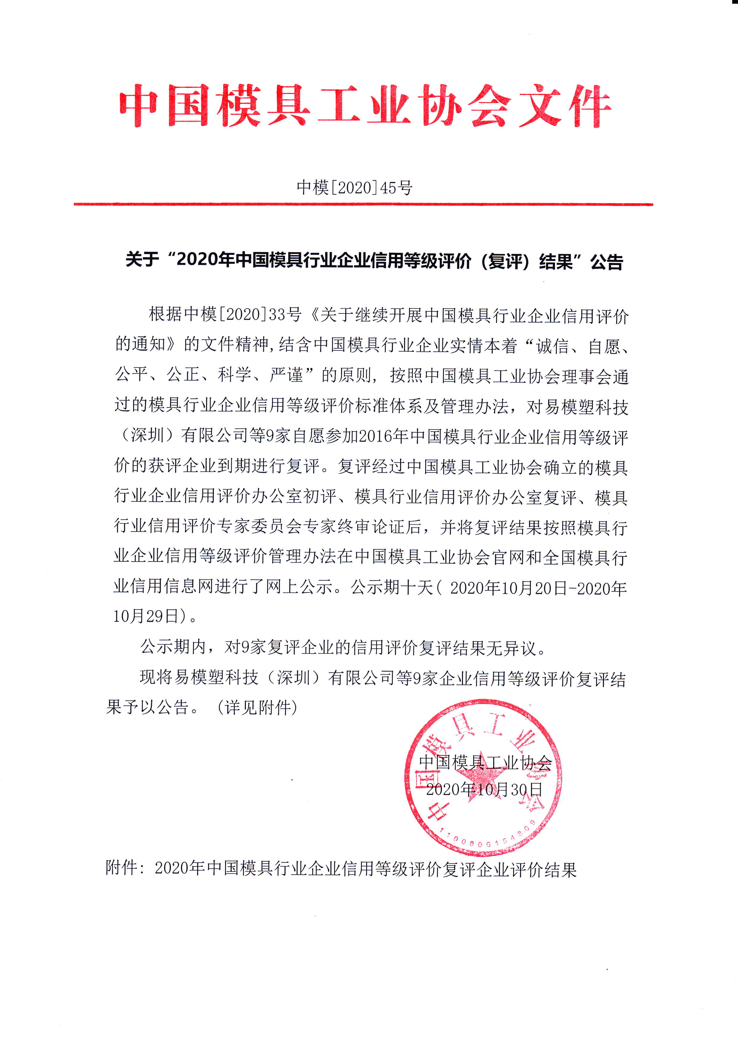 關(guān)于“2020年中國模具行業(yè)企業(yè)信用等級評價(復(fù)評)結(jié)果”公告